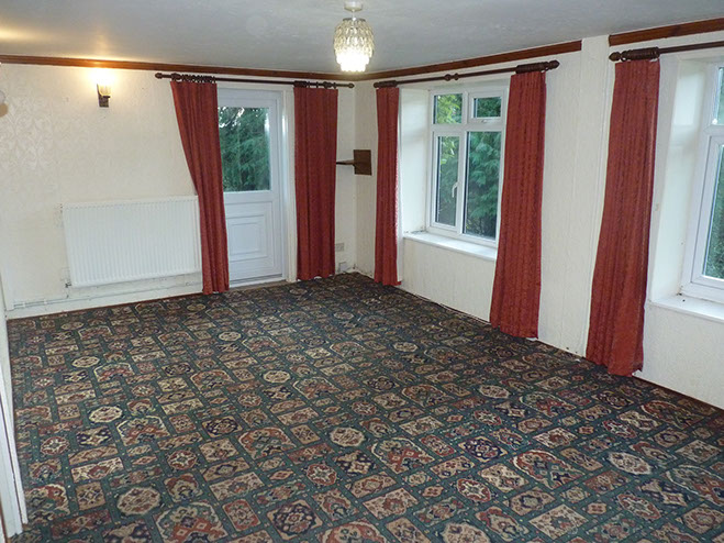 An external access at the rear leads into a cavity block-work EXTENSION, which requires finishing works including plastering, but with the first fix of plumbing and electrics in situ. There is a half-glazed door into a LOBBY 7’6” x 4’ with a concrete floor, a door to BEDROOM (3) 10’10” x 10’4” with two aspects, again having a concrete floor and a timber-clad ceiling. There is provision for four double power points.