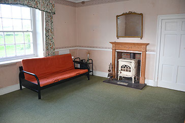 enjoying two aspects to side (W) and rear (N) with view over pastureland under a backdrop of woodland, the suspended board floor has a green fitted carpet, there is a fireplace with a Pine fire surround with Adam style decoration and housing a cream Jotul woodburning stove, slate hearth with ventilation grid, two single panel convector radiators and two double power points.